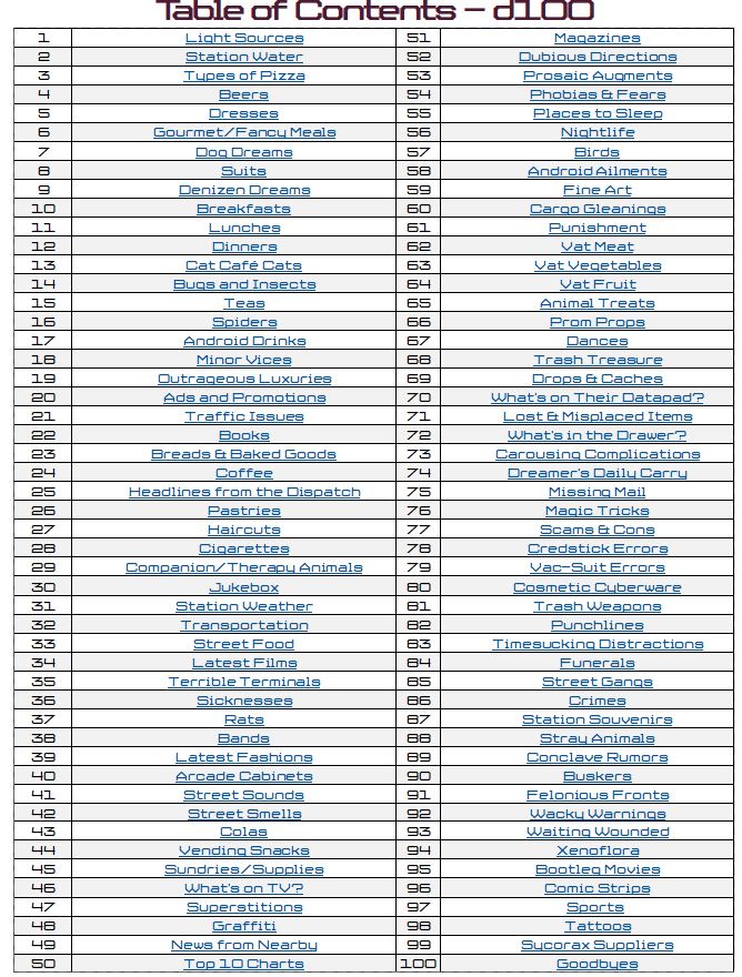 Contained within this document are One Hundred d10 Tables I wrote over the course of my over/under Mothership experience.